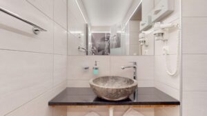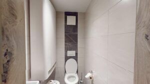 Das Appartement verfügt über ein modernes Badezimmer mit Dusche, ein zusätzliches separates WC sowie einen Balkon mit beeindruckendem Bergpanorama – ein echtes Highlight für alle, die alpine Ruhe und Aussicht genießen möchten.